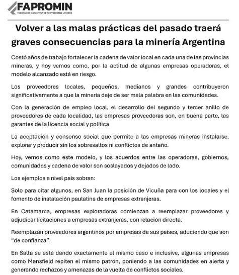 “Costó años de trabajo construir consensos y revertir la mala imagen de la minería. Volver a las prácticas del pasado tendría graves consecuencias para la actividad”, señala el documento difundido por FAPROMIN, que acusa a algunas operadoras de soslayar acuerdos previos con gobiernos y comunidades, y de ignorar las capacidades ya probadas de empresas argentinas.